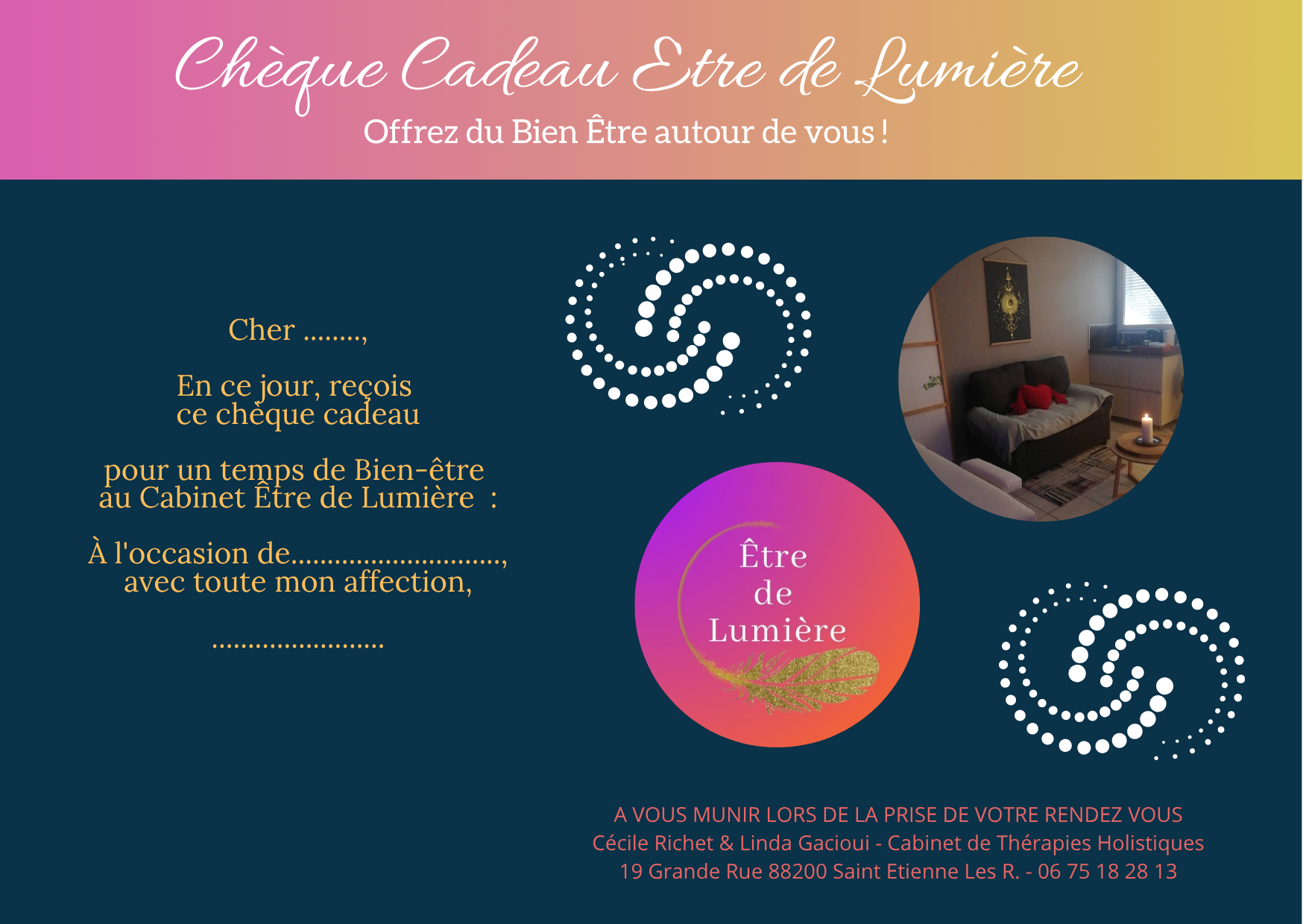 En toute occasion, n’hésitez à pas acheter ce chèque cadeau pour offrir à votre entourage une dose de bien être, pour un accompagnement en soin individuel, que vous retrouverez en détail dans les prestations décrites sur le site.